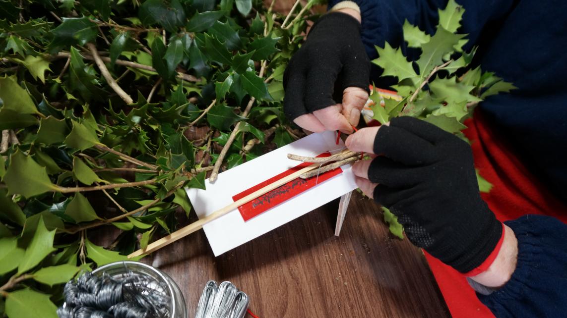 柊に七福之守を飾り付けています。